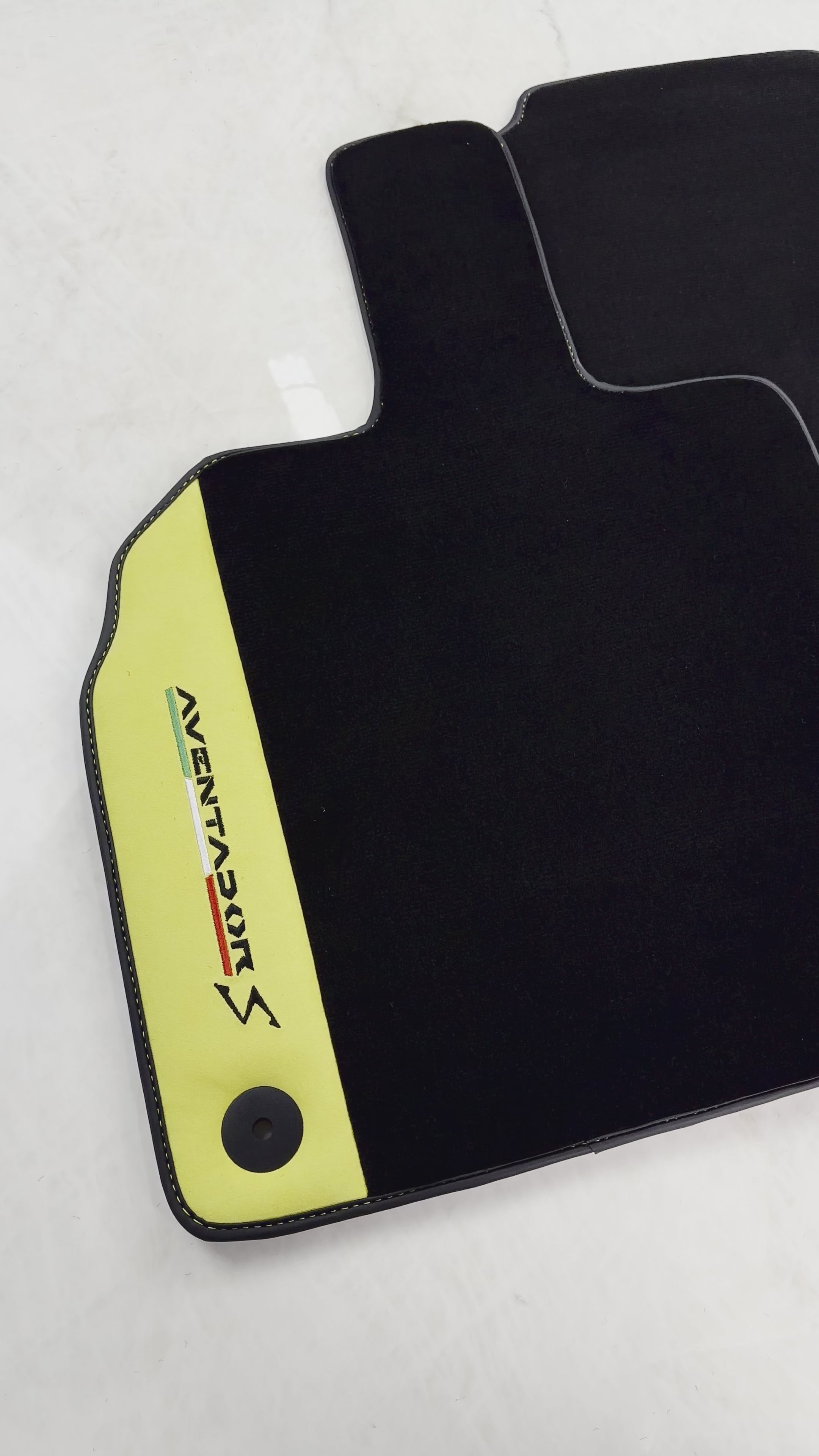 Enhance the luxurious interior of your Lamborghini Aventador S with our Black Floor Mats, crafted with premium Yellow Alcantara Leather for added comfort and style. Keep your floors clean and protected while elevating your driving experience. Expertly designed for a perfect fit, these mats are a must-have for any Lamborghini owner.