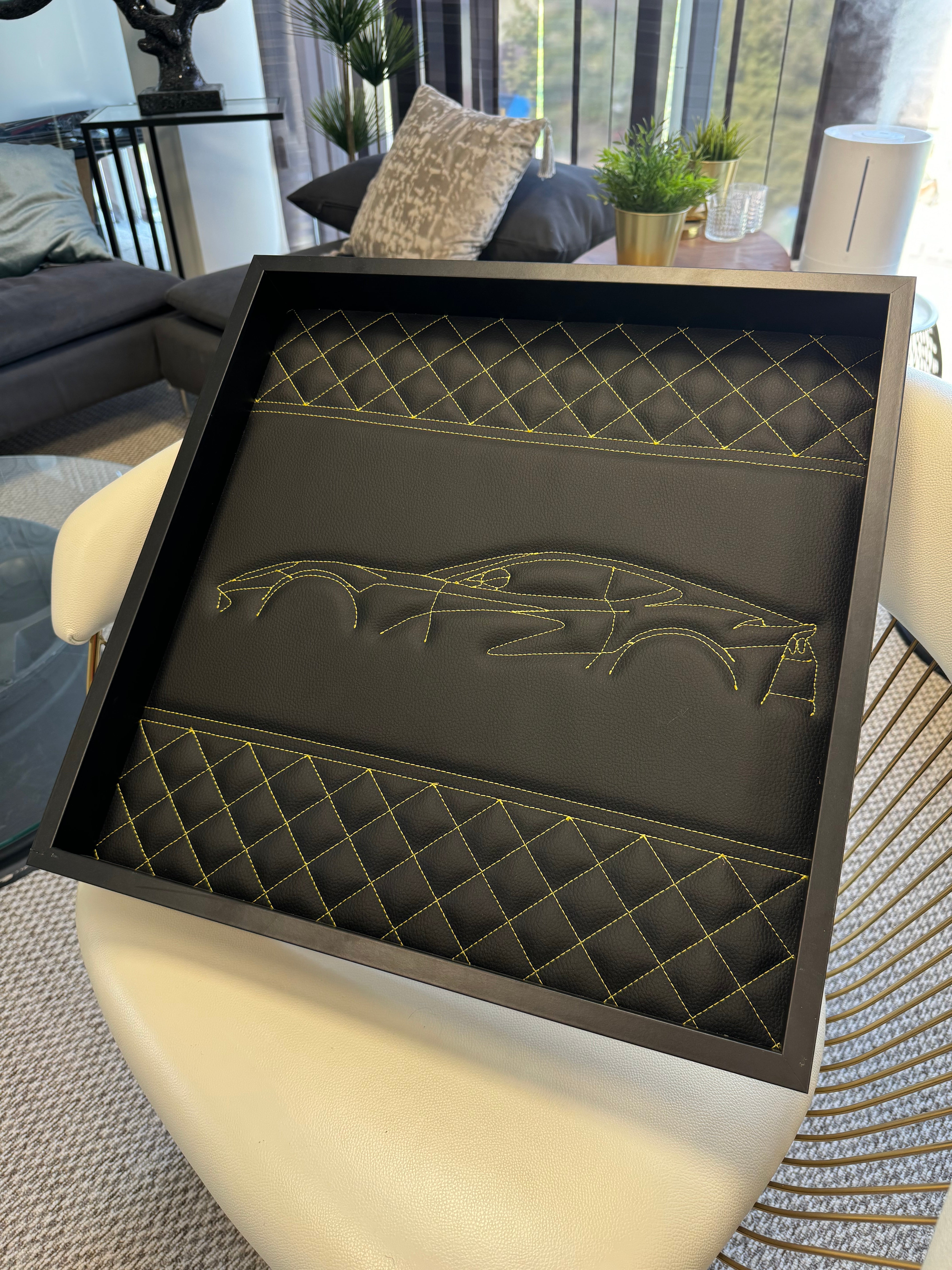 Cette œuvre d'art murale en cuir noir est inspirée de la Ferrari 812 Superfast et présente des coutures jaunes brodées, créant un design luxueux et unique. Fabriqué avec des matériaux de haute qualité, il ajoute une touche de sophistication à n'importe quelle pièce. Améliorez votre décor avec cette pièce d'exception.