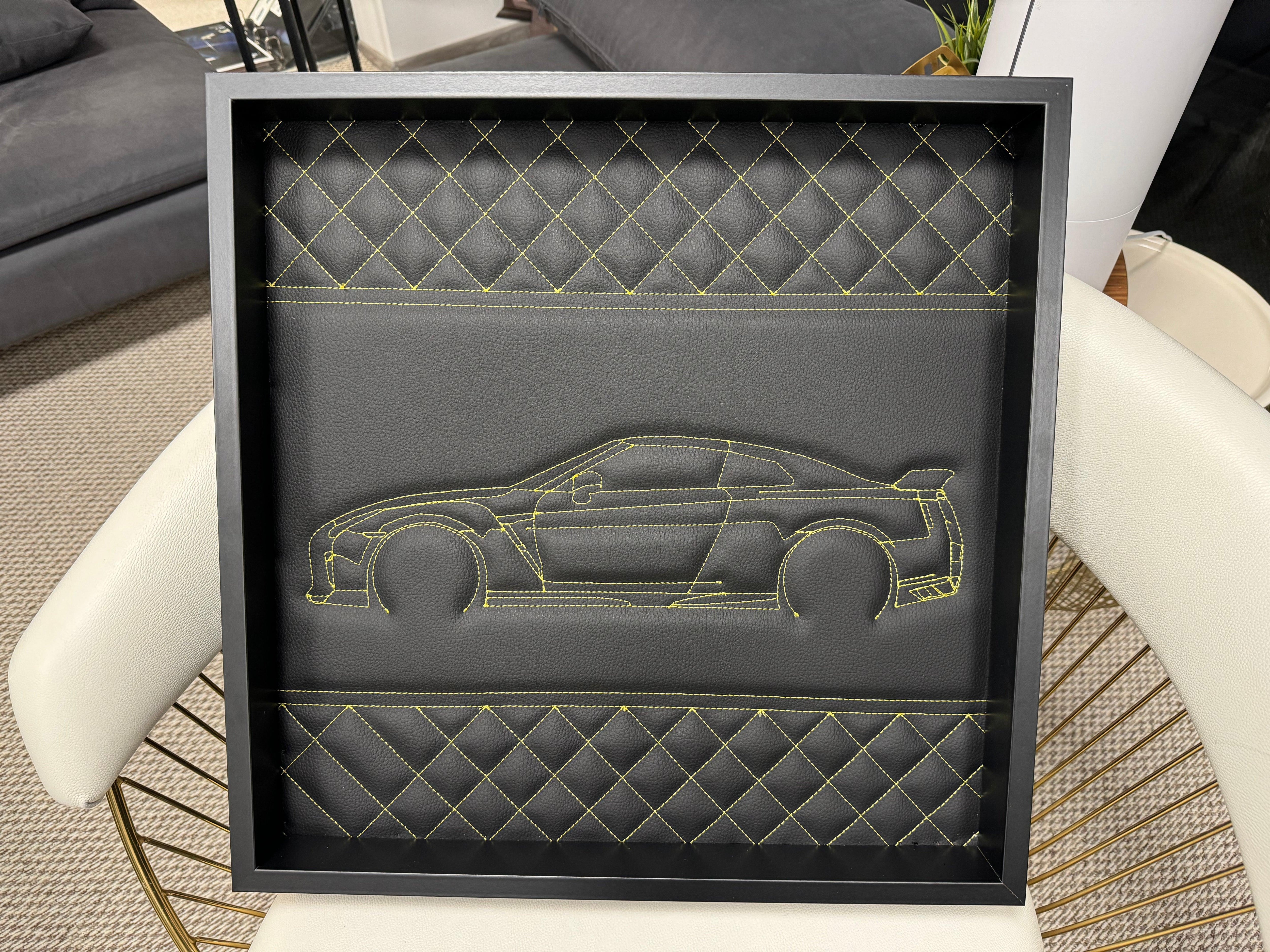 Art mural en cuir noir inspiré de la Nissan GTR : Décor de luxe avec coutures jaunes brodées